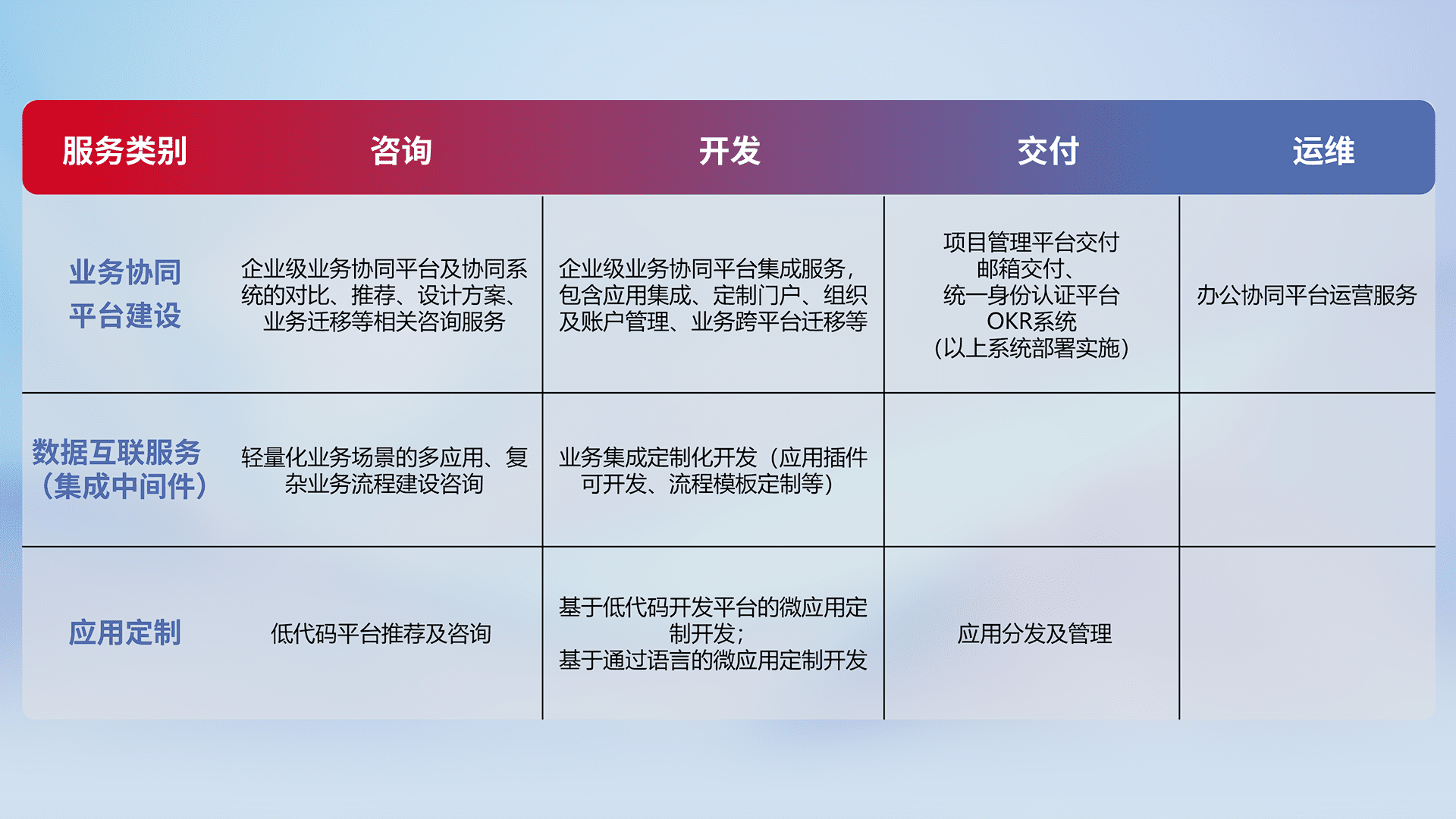针对钉钉、、、企微、、、、IDaas等平台级产品提供产品的规划、、、、方案、、、、交付、、、、定制化开发等服务,,,,实现如统一协同办公、、、智能客户服务、、混合会议管理、、智能数据查询、、等业务场景,,实现数字化转型。。
