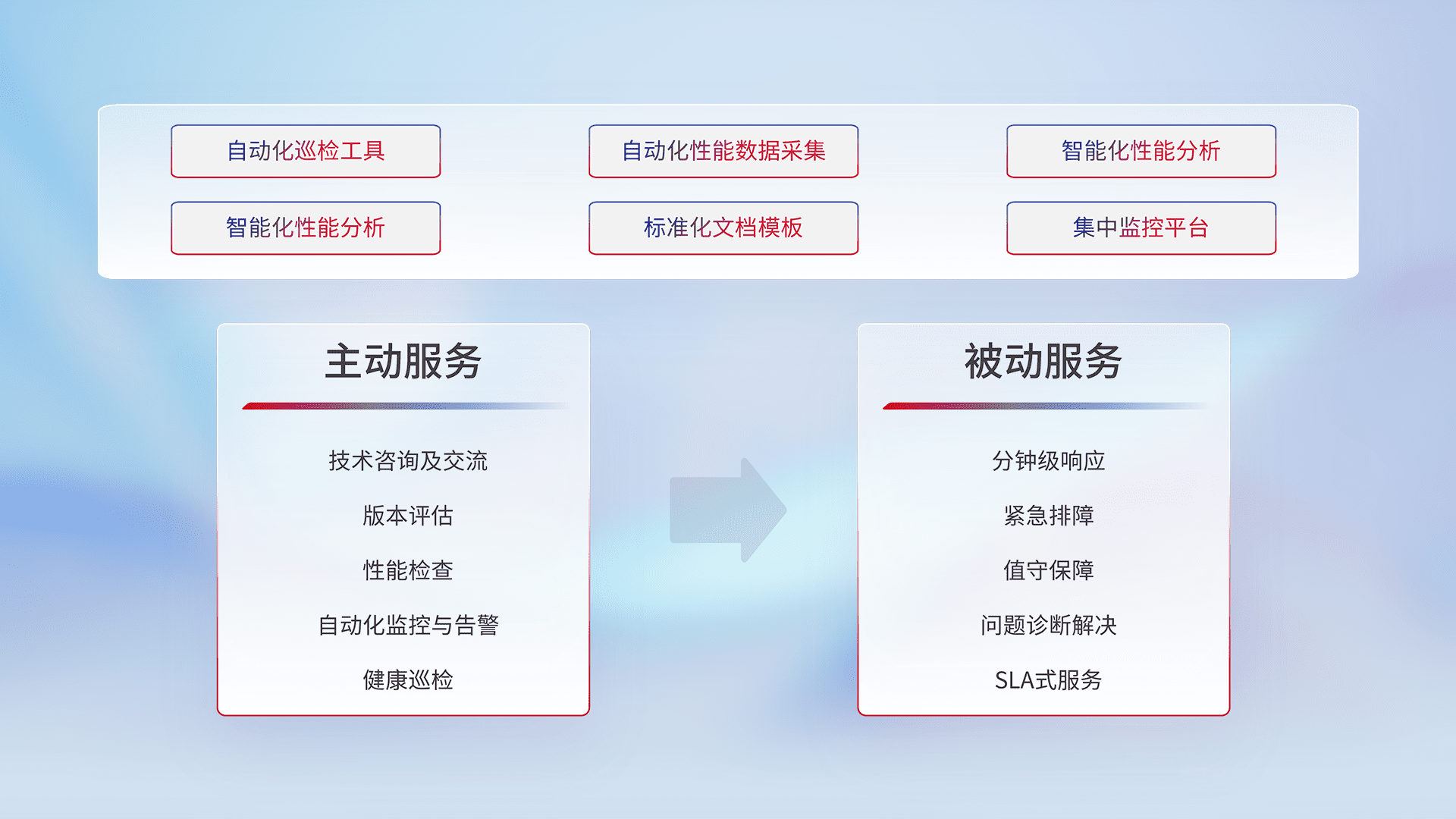 智能化工具和标准化文档,,保障服务质量,,,,提供主动服务(包含技术咨询、、版本评估、、、、性能检查、、、自动化监控与告警、、、健康巡检)和被动服务包含(分钟级响应、、、、紧急排障、、、、值守保障、、、问题诊断解决、、、SLA服务)。。。